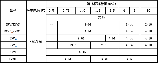 | KVV | 聚氯乙烯绝缘,聚氯乙烯护套控制电缆 | 敷设在室内、电缆沟中、管道内及地下。 |